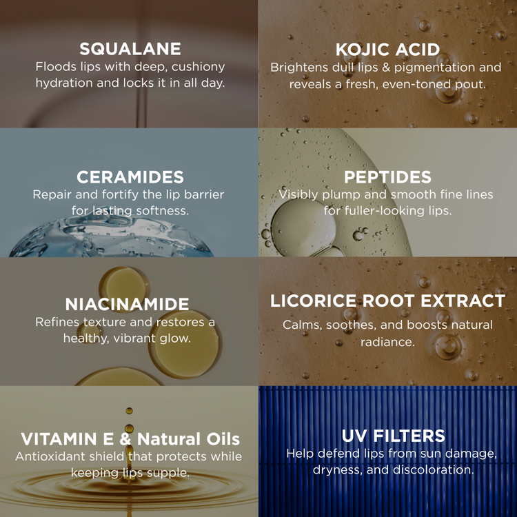 Supercharged with squalane, ceramides, peptides, kojic acid, niacinamide, licorice root extract and antioxidants, it doesn’t just hydrate — it helps strengthen your lip barrier, reduce dryness, brighten lip pigmentation and keep lips plump and nourished.